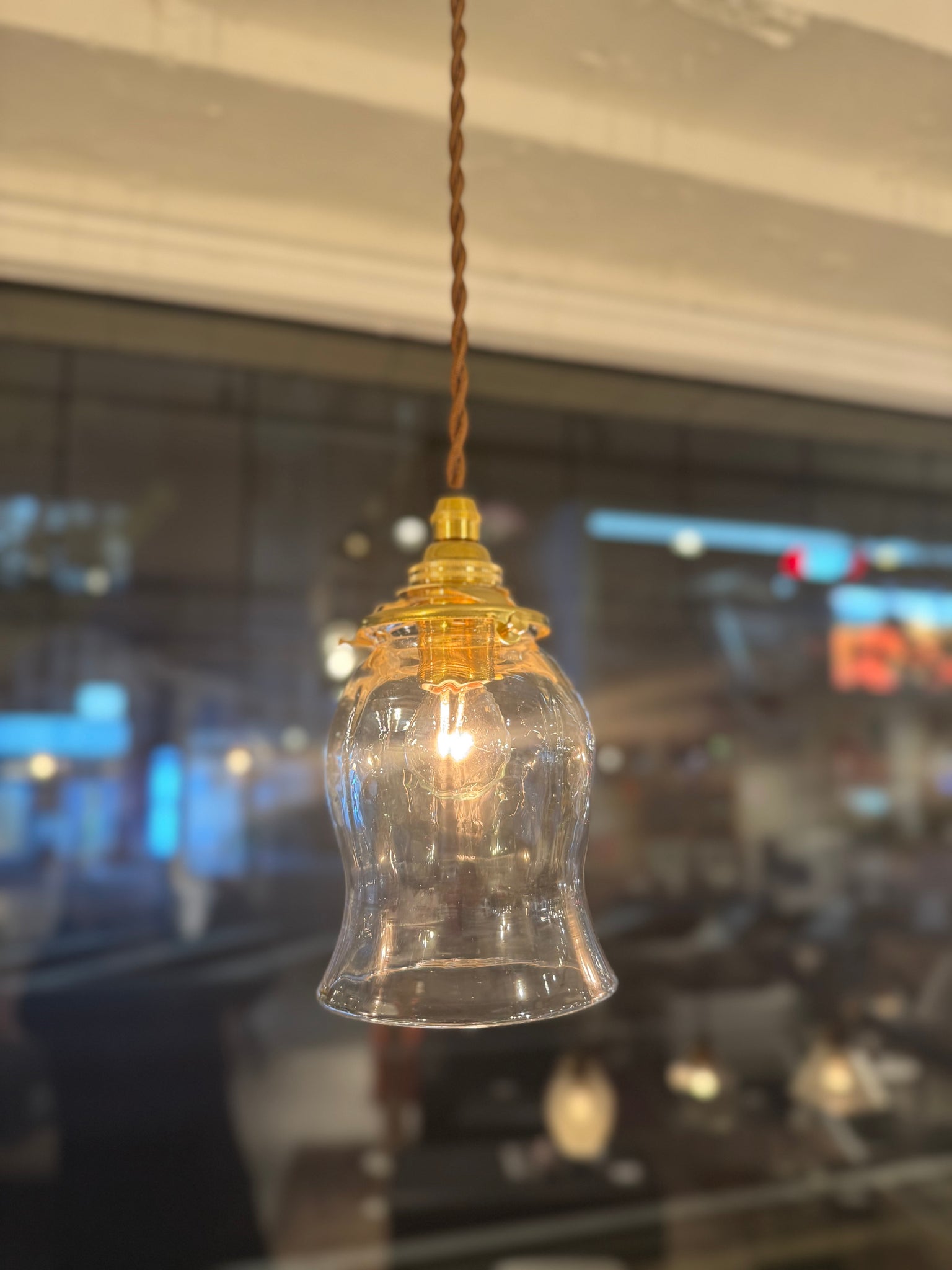 しとやかに広がるベル型の影は、空間に静謐な彩りを与え、その透明な輝きは軽やかな存在感を宿します。吹きガラスが生み出す、ゆらめく光の筋と泡のきらめきは唯一無二。それは、まさにあなただけの灯り。