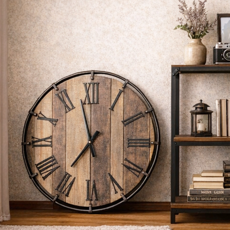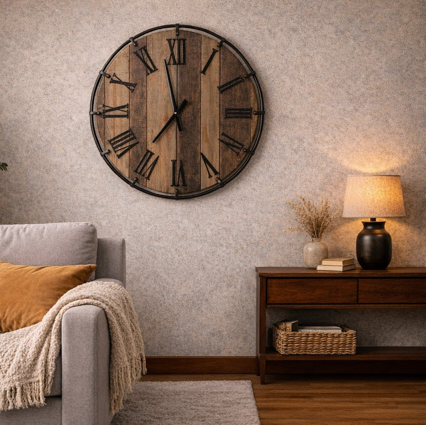 柔らかな木目が静かに浮かび上がるフェイスに、アイアンのフレームとローマ数字が空間を引き締め、穏やかで芯のある佇まいを実現しています。