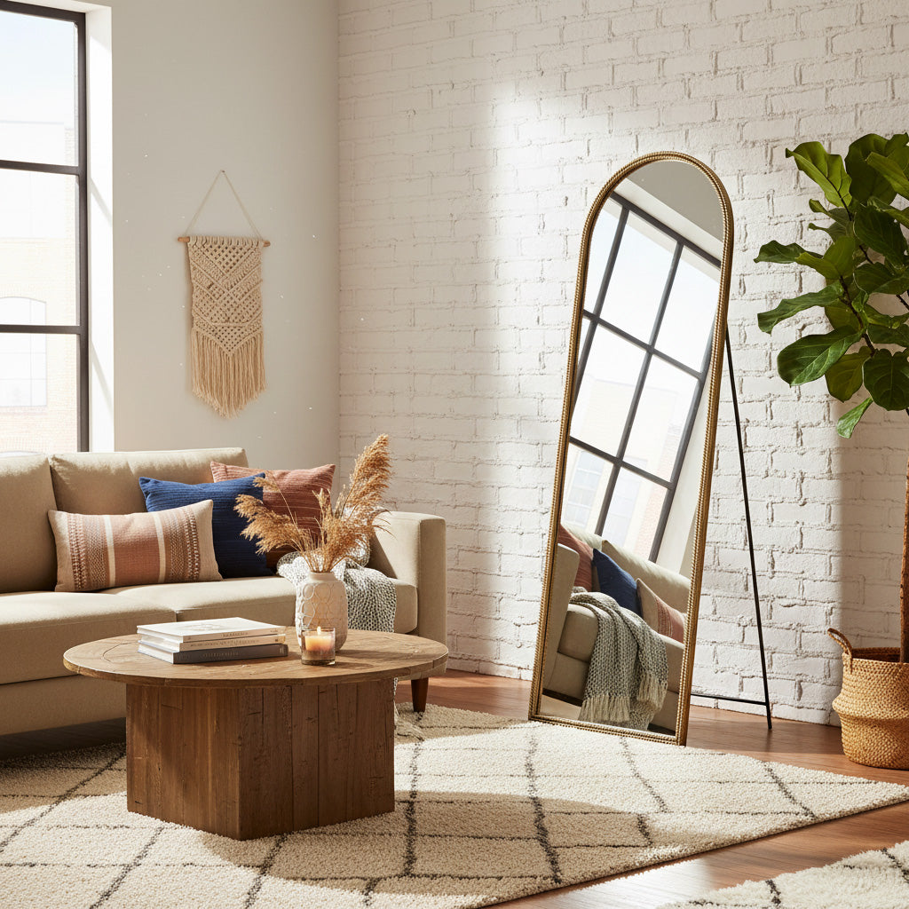 スタンド付きのミラー「ローリン」は、実用性とエレガントなデザインを兼ね備え、寝室や玄関に最適です。
